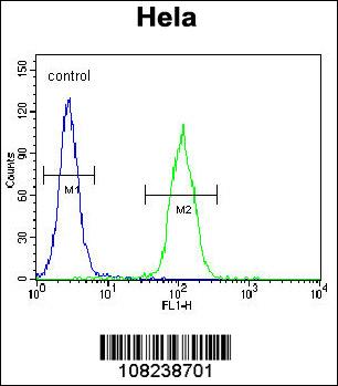LMTK3 Antibody (N-term) (Cat. APR17222G) flow cytometric analysis of Hela cells (right histogram) compared to a negative control cell (left histogram).FITC-conjugated goat-anti-rabbit secondary antibodies were used for the analysis. |