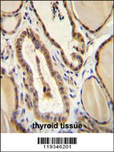 GUCY2D Antibody (Center) (Cat. APR12322G)immunohistochemistry analysis in formalin fixed and paraffin embedded human thyroid tissue followed by peroxidase conjugation of the secondary antibody and DAB staining.This data demonstrates the use of GUCY2D Antibody (Center) for immunohistochemistry. Clinical relevance has not been evaluated. |