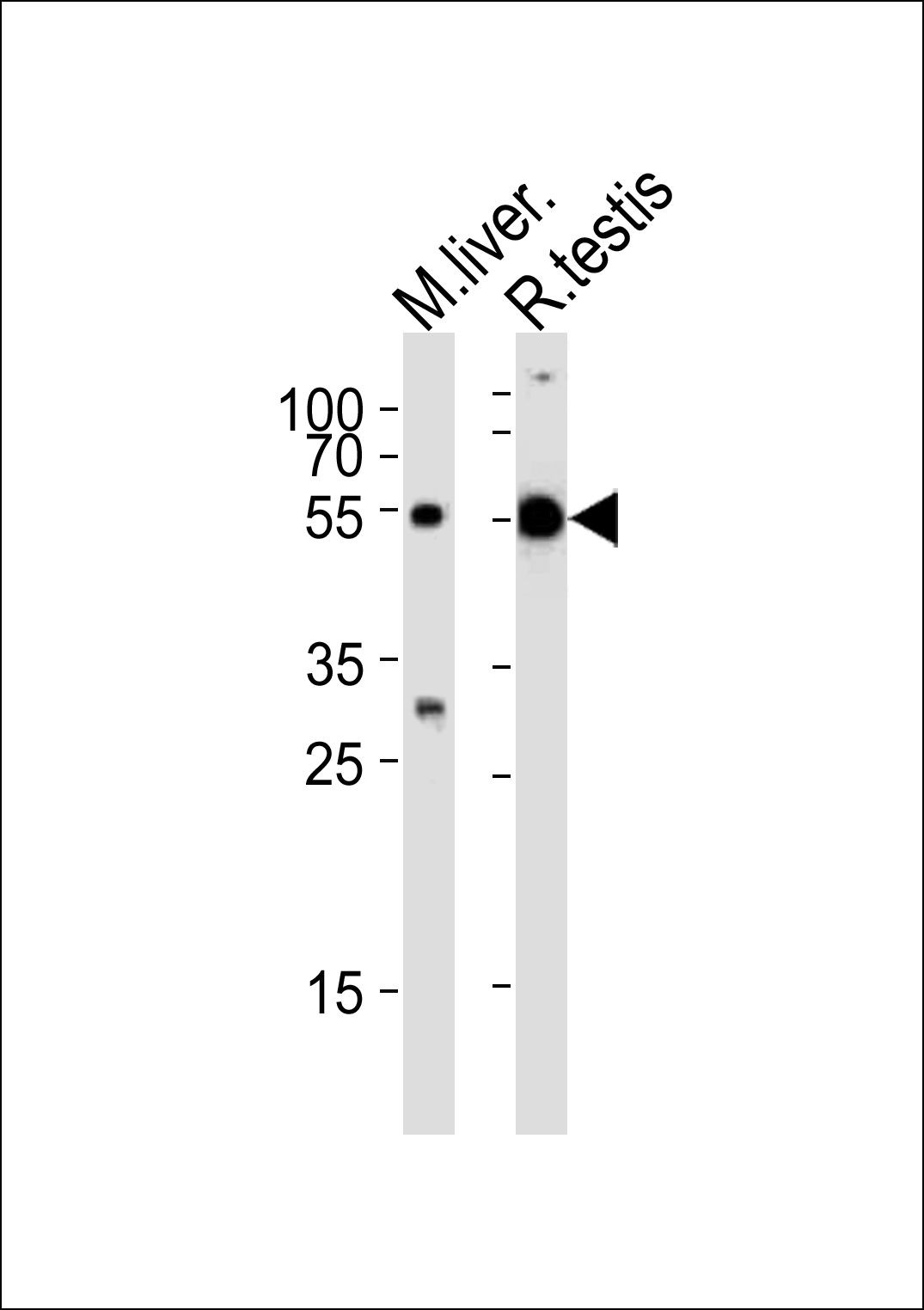 Western blot analysis of lysates from mouse liver and rat testis tissue lysate (from left to right), using TUBA1C Antibody (C-term)( APR14416G). APR14416G was diluted at 1:1000 at each lane. A goat anti-rabbit IgG H&L(HRP) at 1:5000 dilution was used as the secondary antibody. Lysates at 35ug per lane. |