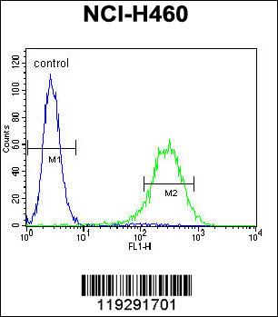 ENPEP Antibody (C-term) (Cat. APR15828G) flow cytometric analysis of NCI-H460 cells (right histogram) compared to a negative control cell (left histogram).FITC-conjugated goat-anti-rabbit secondary antibodies were used for the analysis. |
