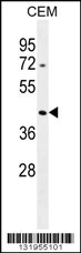ACTBL3 Antibody (N-term) (Cat. APR14775G) western blot analysis in CEM cell line lysates (35ug/lane).This demonstrates the ACTBL3 antibody detected the ACTBL3 protein (arrow). |