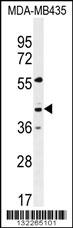 GPR45 Antibody (Center) (Cat. APR12224G) western blot analysis in MDA-MB435 cell line lysates (35ug/lane).This demonstrates the GPR45 antibody detected the GPR45 protein (arrow). |