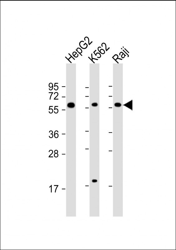 All lanes : Anti-TGFB1 Antibody (N-term) at 1:2000 dilution Lane 1: HepG2 whole cell lysate Lane 2: K562 whole cell lysate Lane 3: Raji whole cell lysate Lysates/proteins at 20 μg per lane. Secondary Goat Anti-Rabbit IgG, (H+L), Peroxidase conjugated at 1/10000 dilution. Predicted band size : 44 kDa Blocking/Dilution buffer: 5% NFDM/TBST.