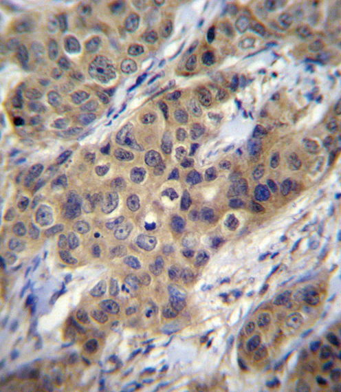 TGFB1 Antibody (N-term) (Cat. APR07196G)immunohistochemistry analysis in formalin fixed and paraffin embedded human breast carcinoma followed by peroxidase conjugation of the secondary antibody and DAB staining.This data demonstrates the use of TGFB1 Antibody (N-term) for immunohistochemistry. Clinical relevance has not been evaluated. |