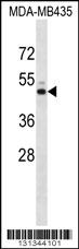 KCNJ13 Antibody (N-term) (Cat. AMM06103G) western blot analysis in MDA-MB435 cell line lysates (35ug/lane).This demonstrates the KCNJ13 antibody detected the KCNJ13 protein (arrow).