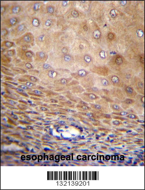 TMEM43 Antibody (Center) (Cat. AMM08238G)immunohistochemistry analysis in formalin fixed and paraffin embedded human esophageal carcinoma followed by peroxidase conjugation of the secondary antibody and DAB staining.This data demonstrates the use of TMEM43 Antibody (Center) for immunohistochemistry. Clinical relevance has not been evaluated. |