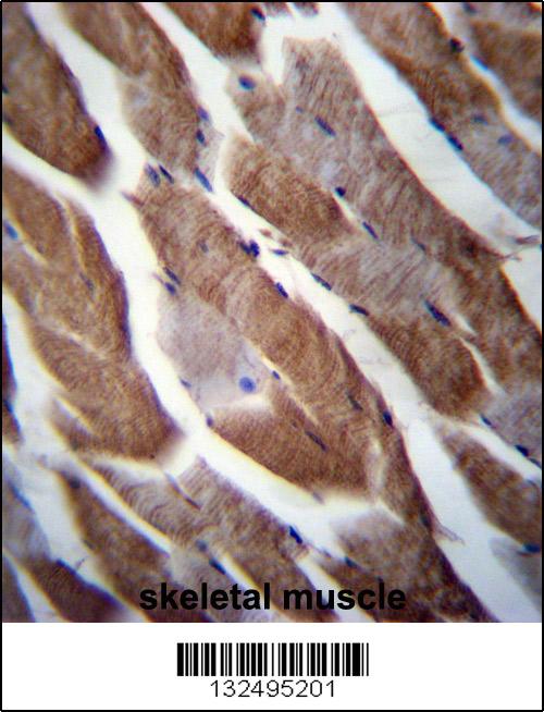 MATN1 Antibody (C-term) (Cat. APR17340G)immunohistochemistry analysis in formalin fixed and paraffin embedded human skeletal muscle followed by peroxidase conjugation of the secondary antibody and DAB staining.This data demonstrates the use of MATN1 Antibody (C-term) for immunohistochemistry. Clinical relevance has not been evaluated. |