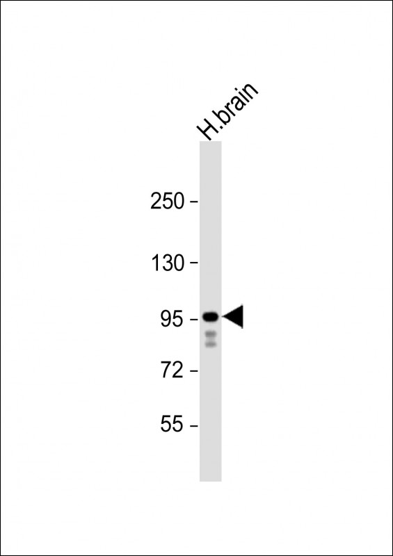 Anti-GRIA4 Antibody (Center) at 1:1000 dilution + human brain lysate Lysates/proteins at 20 μg per lane. Secondary Goat Anti-Rabbit IgG, (H+L), Peroxidase conjugated at 1/10000 dilution. Predicted band size : 101 kDa Blocking/Dilution buffer: 5% NFDM/TBST.