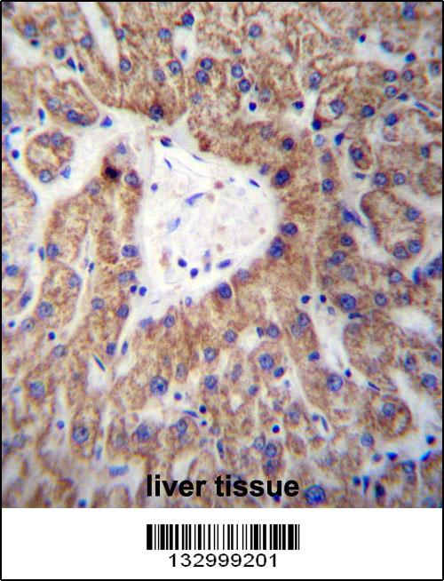 GLYAT Antibody (Center) (Cat. AMM04815G)immunohistochemistry analysis in formalin fixed and paraffin embedded human liver tissue followed by peroxidase conjugation of the secondary antibody and DAB staining.This data demonstrates the use of GLYAT Antibody (Center) for immunohistochemistry. Clinical relevance has not been evaluated. |