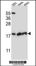 DHFRL1 Antibody (Center) (Cat. APR07559G) western blot analysis in 293,Hela,K562 cell line lysates (35ug/lane).This demonstrates the DHFRL1 antibody detected the DHFRL1 protein (arrow).