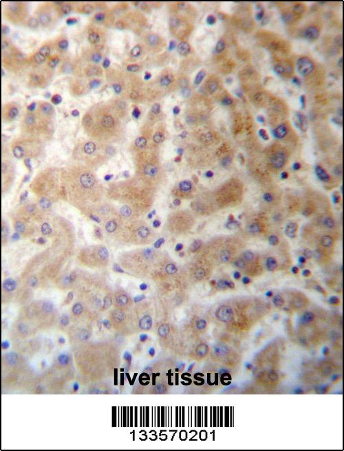 DHFRL1 Antibody (Center) (Cat. APR07559G)immunohistochemistry analysis in formalin fixed and paraffin embedded human liver tissue followed by peroxidase conjugation of the secondary antibody and DAB staining.This data demonstrates the use of DHFRL1 Antibody (Center) for immunohistochemistry. Clinical relevance has not been evaluated. |
