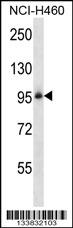 ITGB5 Antibody (N-term) (Cat. APR14347G) western blot analysis in NCI-H460 cell line lysates (35ug/lane).This demonstrates the ITGB5 antibody detected the ITGB5 protein (arrow).