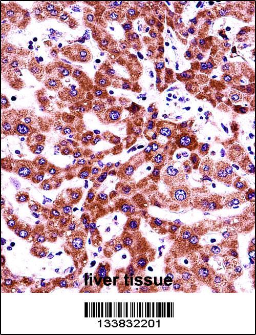 ITGB5 Antibody (N-term) (Cat. APR14347G)immunohistochemistry analysis in formalin fixed and paraffin embedded human liver tissue followed by peroxidase conjugation of the secondary antibody and DAB staining.This data demonstrates the use of ITGB5 Antibody (N-term) for immunohistochemistry. Clinical relevance has not been evaluated. |
