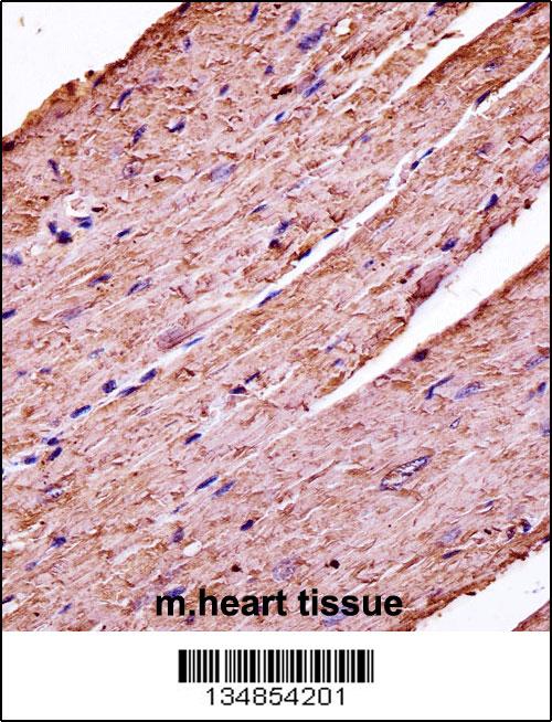 Mouse Pdk3 Antibody (C-term) (APR07135G)immunohistochemistry analysis in formalin fixed and paraffin embedded mouse heart tissue followed by peroxidase conjugation of the secondary antibody and DAB staining.This data demonstrates the use of Mouse Pdk3 Antibody (C-term) for immunohistochemistry. Clinical relevance has not been evaluated. |