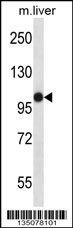Mouse Mastl Antibody (Center) (Cat. APR17431G) western blot analysis in mouse liver tissue lysates (35ug/lane).This demonstrates the Mastl antibody detected the Mastl protein (arrow). |
