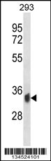 PPP6C Antibody (C-term) (Cat. AMM07311G) western blot analysis in 293 cell line lysates (35ug/lane).This demonstrates the PPP6C antibody detected the PPP6C protein (arrow). |