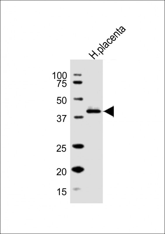 Anti-HSD3B1 Antibody (N-term) at 1:1000 dilution + human placenta lysate Lysates/proteins at 20 μg per lane. Secondary Goat Anti-Rabbit IgG, (H+L), Peroxidase conjugated at 1/10000 dilution. Predicted band size : 42 kDa Blocking/Dilution buffer: 5% NFDM/TBST.