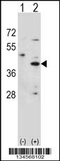 Western blot analysis of HSD3B1 (arrow) using rabbit polyclonal HSD3B1 Antibody (N-term) (Cat. APR07824G). 293 cell lysates (2 ug/lane) either nontransfected (Lane 1) or transiently transfected (Lane 2) with the HSD3B1 gene. |
