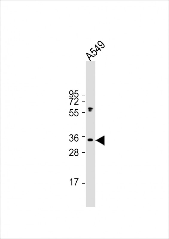 Anti-ORAI1 Antibody (C-term) at 1:1000 dilution + A549 whole cell lysate Lysates/proteins at 20 μg per lane. Secondary Goat Anti-Rabbit IgG, (H+L), Peroxidase conjugated at 1/10000 dilution. Predicted band size : 33 kDa Blocking/Dilution buffer: 5% NFDM/TBST. |
