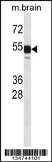 Mouse Clk1 Antibody (N-term) (Cat. APR17412G) western blot analysis in mouse brain tissue lysates (35ug/lane).This demonstrates the Clk1 antibody detected the Clk1 protein (arrow). |