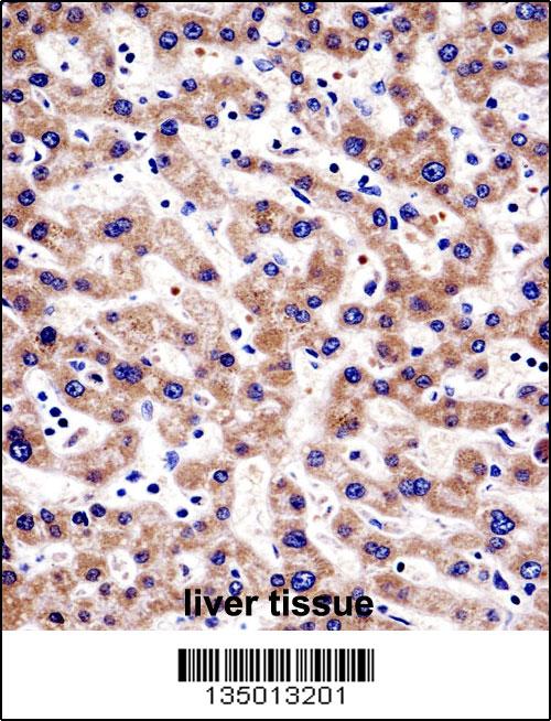 HTATIP2 Antibody (N-term) (AMM05388G)immunohistochemistry analysis in formalin fixed and paraffin embedded human liver tissue followed by peroxidase conjugation of the secondary antibody and DAB staining.This data demonstrates the use of HTATIP2 Antibody (N-term) for immunohistochemistry. Clinical relevance has not been evaluated. |
