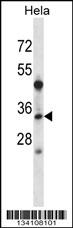 LAT2 Antibody (Center) (Cat. APR17173G) western blot analysis in Hela cell line lysates (35ug/lane).This demonstrates the LAT2 antibody detected the LAT2 protein (arrow). |