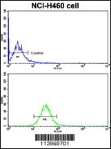 Flow cytometric analysis of NCI-H460 cells using Cadherin 10 (CDH10) Antibody (C-term) (bottom histogram) compared to a negative control cell (top histogram). FITC-conjugated goat-anti-rabbit secondary antibodies were used for the analysis. |