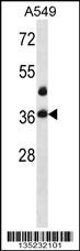LASP1 Antibody (Center) (Cat. APR17153G) western blot analysis in A549 cell line lysates (35ug/lane).This demonstrates the LASP1 antibody detected the LASP1 protein (arrow). |