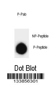 Dot blot analysis of Phospho-SNAP25-pT138 Antibody Phospho-specific Pab (Cat. APR09229G) on nitrocellulose membrane. 50ng of Phospho-peptide or Non Phospho-peptide per dot were adsorbed. Antibody working concentrations are 0.6ug per ml. |