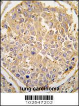 Formalin-fixed and paraffin-embedded human lung carcinoma tissue reacted with DKK4 antibody (N-term) (Cat. APR14289G), which was peroxidase-conjugated to the secondary antibody, followed by DAB staining. This data demonstrates the use of this antibody for immunohistochemistry; clinical relevance has not been evaluated. |