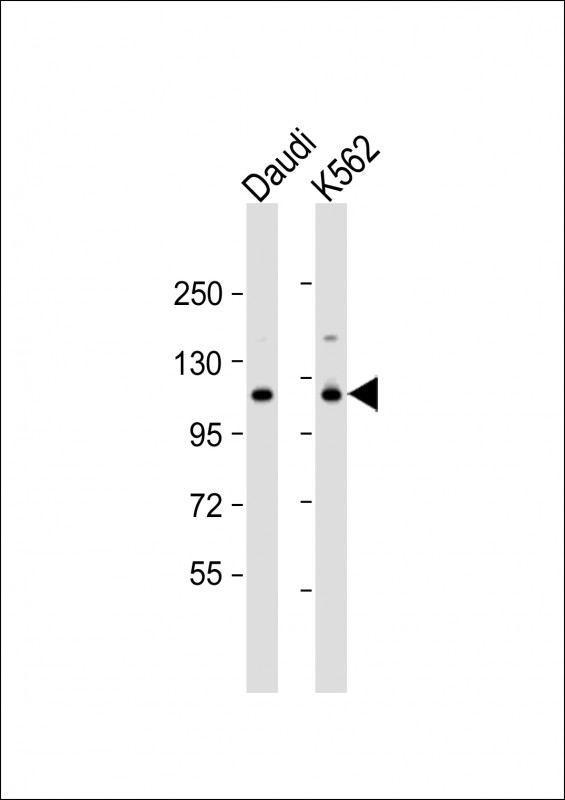 All lanes : Anti-STAT2 Antibody (S853) at 1:1000 dilution Lane 1: Daudi whole cell lysate Lane 2: K562 whole cell lysate Lysates/proteins at 20 μg per lane. Secondary Goat Anti-Rabbit IgG, (H+L), Peroxidase conjugated at 1/10000 dilution. Predicted band size : 98 kDa Blocking/Dilution buffer: 5% NFDM/TBST.
