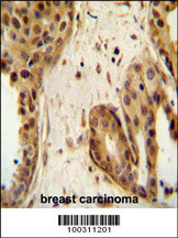 STAT2 Antibody (C-term) (Cat. AMM08015G) immunohistochemistry analysis in formalin fixed and paraffin embedded human breast carcinoma followed by peroxidase conjugation of the secondary antibody and DAB staining. This data demonstrates the use of the STAT2 Antibody (C-term) for immunohistochemistry. Clinical relevance has not been evaluated. |