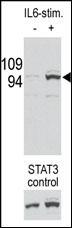 STAT3 is a member of the STAT protein family. In response to cytokines and growth factors, STAT family members are phosphorylated by the receptor associated kinases, and then form homo- or heterodimers that translocate to the cell nucleus where they act as transcription activators. This protein is activated through phosphorylation in response to various cytokines and growth factors including IFNs, EGF, IL5, IL6, HGF, LIF and BMP2. This protein mediates the expression of a variety of genes in response to cell stimuli, and thus plays a key role in many cellular processes such as cell growth and apoptosis. The small GTPase Rac1 has been shown to bind and regulate the activity of this protein. PIAS3 protein is a specific inhibitor of this protein.