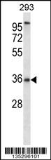 P2RY6 Antibody (C-term) (Cat. APR17718G) western blot analysis in 293 cell line lysates (35ug/lane).This demonstrates the P2RY6 antibody detected the P2RY6 protein (arrow). |