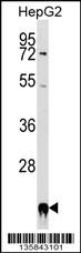 PPIF Antibody (Center) (Cat. AMR09464G) western blot analysis in HepG2 cell line lysates (35ug/lane).This demonstrates the PPIF antibody detected the PPIF protein (arrow). |