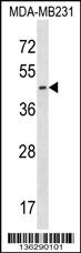 EGLN2 Antibody (N-term) (Cat. APR07646G) western blot analysis in MDA-MB231 cell line lysates (35ug/lane).This demonstrates the EGLN2 antibody detected the EGLN2 protein (arrow). |