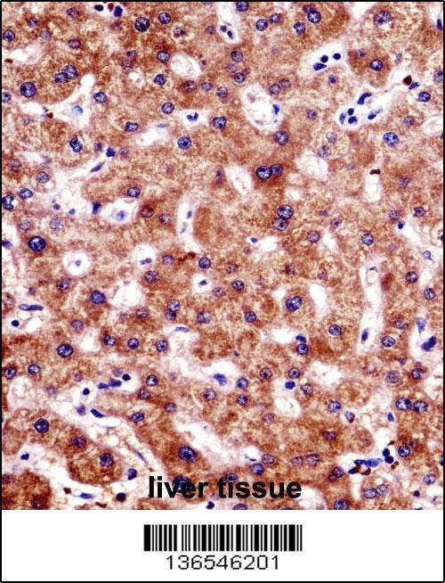 BCL7B Antibody (C-term) (APG02260G)immunohistochemistry analysis in formalin fixed and paraffin embedded human liver tissue followed by peroxidase conjugation of the secondary antibody and DAB staining.This data demonstrates the use of BCL7B Antibody (C-term) for immunohistochemistry. Clinical relevance has not been evaluated. |