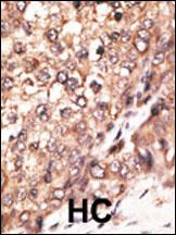Formalin-fixed and paraffin-embedded human cancer tissue reacted with the primary antibody, which was peroxidase-conjugated to the secondary antibody, followed by DAB staining. This data demonstrates the use of this antibody for immunohistochemistry; clinical relevance has not been evaluated. BC = breast carcinoma; HC = hepatocarcinoma.