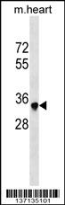 Mouse Sbk2 Antibody (C-term) (Cat. APR17444G) western blot analysis in mouse heart tissue lysates (35ug/lane).This demonstrates the Sbk2 antibody detected the Sbk2 protein (arrow). |