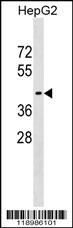 WIPI1 Antibody (Center) (Cat. APR10749G) western blot analysis in HepG2 cell line lysates (35ug/lane).This demonstrates the WIPI1 antibody detected the WIPI1 protein (arrow). |