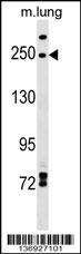 INF2 Antibody (Center) (Cat. APR16847G) western blot analysis in mouse lung tissue lysates (35ug/lane).This demonstrates the INF2 antibody detected the INF2 protein (arrow). |