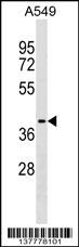 ZCCHC12 Antibody (C-term) (Cat. AMM08541G) western blot analysis in A549 cell line lysates (35ug/lane).This demonstrates the ZCCHC12 antibody detected the ZCCHC12 protein (arrow). |