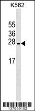 LZIC Antibody (Center) (Cat. APR12484G) western blot analysis in K562 cell line lysates (35ug/lane).This demonstrates the LZIC antibody detected the LZIC protein (arrow). |
