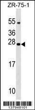 NXNL1 Antibody (Center) (Cat. APR08878G) western blot analysis in ZR-75-1 cell line lysates (35ug/lane).This demonstrates the NXNL1 antibody detected the NXNL1 protein (arrow). |