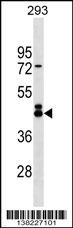 EFCAB4B Antibody (N-term) (Cat. APR15801G) western blot analysis in 293 cell line lysates (35ug/lane).This demonstrates the EFCAB4B antibody detected the EFCAB4B protein (arrow). |
