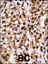 Formalin-fixed and paraffin-embedded human cancer tissue reacted with the primary antibody, which was peroxidase-conjugated to the secondary antibody, followed by DAB staining. This data demonstrates the use of this antibody for immunohistochemistry; clinical relevance has not been evaluated. BC = breast carcinoma; HC = hepatocarcinoma.