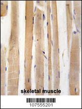 Formalin-fixed and paraffin-embedded human skeletal muscle tissue reacted with Autophagy APG4A Antibody (C-term) (Cat. APG02043G), which was peroxidase-conjugated to the secondary antibody, followed by DAB staining. This data demonstrates the use of this antibody for immunohistochemistry; clinical relevance has not been evaluated. |