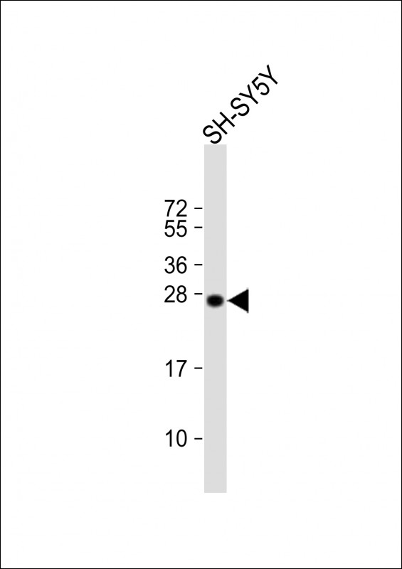 Anti-SNAP25 Antibody (Center) at 1:1000 dilution + SH-SY5Y whole cell lysate Lysates/proteins at 20 μg per lane. Secondary Goat Anti-Rabbit IgG, (H+L), Peroxidase conjugated at 1/10000 dilution. Predicted band size : 23 kDa Blocking/Dilution buffer: 5% NFDM/TBST. |