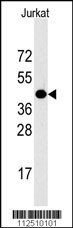 Western blot analysis of LAMP1 Antibody (C-term) (Cat. APR07122G) in Jurkat cell line lysates (35ug/lane). LAMP1 (arrow) was detected using the purified Pab. |