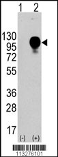 Western blot analysis of LAMP2 (arrow) using LAMP2 Antibody (Center) (Cat. APR08131G). 293 cell lysates (2 ug/lane) either nontransfected (Lane 1) or transiently transfected with the LAMP2 gene (Lane 2) (Origene Technologies). Mature, functional LAMP2 is extensively glycosylated with a variety of different N linked and O linked oligosaccharides with a total molecular weight of ~100-110 kDa. |